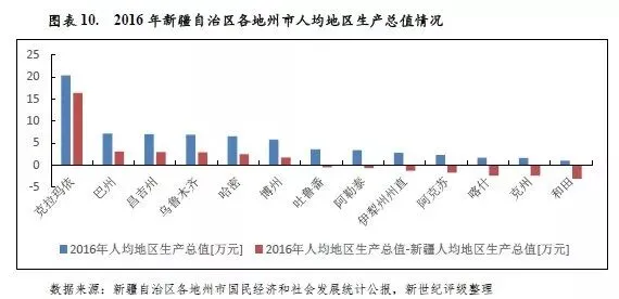 [5]限于公开资料可得性,本文对新疆各地州市人均地区生产总值的分析不包括塔城地区。此外,克拉玛依市、巴州和阿克苏地区数据均由“2016年地区生产总值/当年末总人口”计算得出,其中2016克拉玛依地区生产总值统计口径包含兵团,总人口数据统计口径不包含兵团。