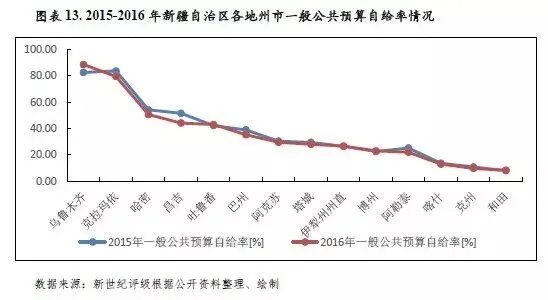 从一般公共预算收入增速来看,2016年新疆各地一般公共预算收入均呈增长态势,各地增速差异有所缩小。其中,伊犁州州直、巴州、吐鲁番市、塔城地区和阿勒泰地区一般公共预算收入增速均由负转正,乌鲁木齐市、克州、哈密地区、和田地区、喀什地区、昌吉州6地则较上年呈不同幅度回落。此外,2016年新疆多地一般公共预算自给率较上年有不同程度下滑,新疆各地州市一般公共预算收支平衡对上级转移支付的依赖程度进一步上升。
