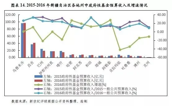2016年,新疆各地州市政府性基金预算收入普遍大幅下滑的局势有所扭转,除克拉玛依市、吐鲁番市、巴州、喀什地区、博州、克州6地仍持续下滑,其余地州市均呈增长态势。同年,与一般公共预算收入规模相比,新疆各地州市地方财力对政府性基金预算收入的依赖度仍普遍较低。