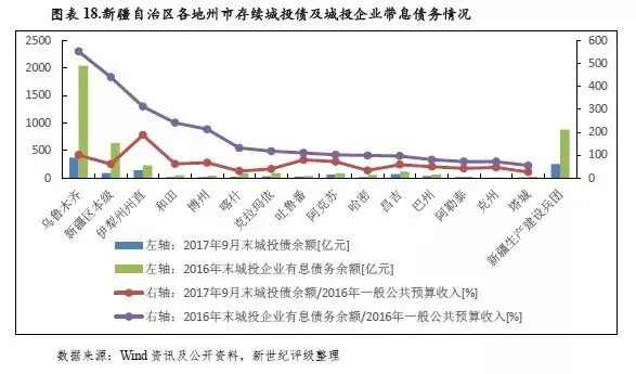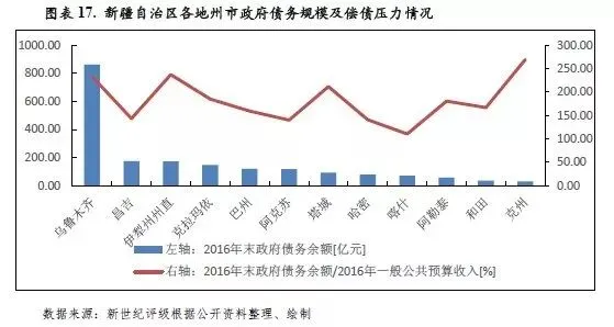 从政府债务偿付压力看,2016年末新疆辖内克州、伊犁州州直、乌鲁木齐市和塔城地区政府债务偿付压力相对较大,上述4地当年末政府债务余额与全年一般公共预算收入的比率均大于200%;其余各地州市该比率均处于100%至200%之间,其中喀什地区该指标处于全区最好水平。