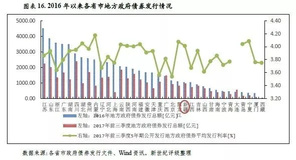 新疆存量地方政府债券系新疆政府债务最主要的构成部分,截至2017年9月末新疆地方政府债券存量余额为2713.97亿元,占2016年末全区政府债务余额的95.67%。从地方政府债券发行利率看,2017年前三季度新疆5年期公开发行地方政府债券平均发行利率为4.01%,高于同期全国各省市5年期公开发行地方政府债券平均发行利率15个BP,居各省市第八位。