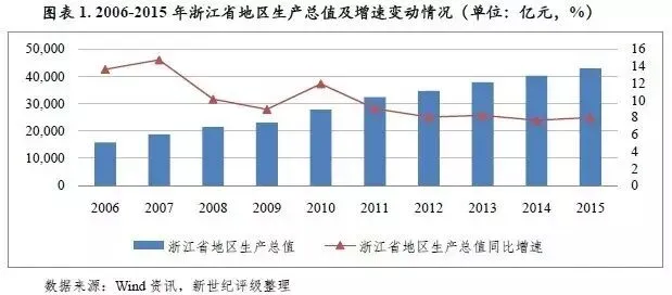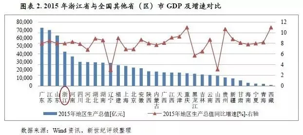浙江省位于我国东南沿海,地处长江三角洲南翼,是长江经济带的覆盖省份,地理位置优越,拥有广阔的腹地和发展空间。从经济总量和二三产业的地均增加值来看,长三角在我国三大经济圈中位列首位,定位为全国的经济中心与增长引擎。地缘格局上,上海作为长三角经济圈的极核,将对江浙两省的经济起到极强的带动作用。浙江省区位优势和战略地位突出,基础设施完善,交通便利。作为近代工业的发祥地之一,经济人文实力雄厚。2015年浙江实现地区生产总值42886.5亿元,居全国第4位,同比增长8.0%,较上年(7.6%)略有提升;人均GDP达到77644元,增长7.6%。“十二五”期间全省地区生产总值年均增速为8.2%,高于全国水平0.2个百分点。