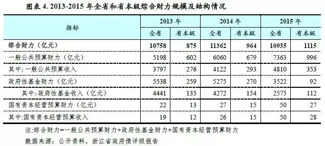 浙江省综合财力雄厚,稳定性强。2013-2015年,浙江省全省综合财力连续三年突破万亿,分别为10758亿元、11362亿元和10935亿元,位于全国各省前列。主要受2015年政府性基金收入大幅下降影响,近三年全省综合财力呈小幅波动态势。其中,一般公共预算收入占综合财力的比重分别为35.29%、36.28%和43.99%,政府性基金预算收入占综合财力的比重分别为41.28%、37.60%和23.55%,两者呈反向变动趋势。从省本级财力看,因省直管县财政体制影响,全省财力向下级政府倾斜力度大,省本级财力占全省财力的比重相对较低。2013-2015年,省本级综合财力分别为875亿元、964亿元和1115亿元。