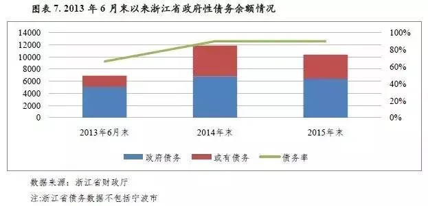 根据浙江省审计厅于2014年1月公告的《浙江省地方政府性债务审计结果》,截至2013年6月末,浙江省地方政府性债务余额为6928.37亿元,位列各省第12位。其中,浙江省各级政府负有偿还责任的债务5088.24亿元,负有担保责任的债务327.09亿元,可能承担一定救助责任的债务1513.04亿元。截至2012年末,浙江省全省政府负有偿还责任债务的债务率为63.48%。若按照2007年以来,各年度全省政府负有担保责任的债务和可能承担一定救助责任的债务当年偿还本金中,由财政资金实际偿还的最高比率折算后,总债务率为66.11%,总债务率位列各省第17位。