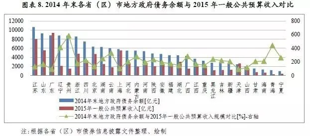 以地方政府债务余额与一般公共预算收入规模相对比,2014年末浙江省地方政府债务余额是其2015年一般公共预算收入的1.79倍,位列全国各省(区)市第19位,处于相对较低水平;同期末,贵州省、青海省、辽宁省、云南省、广西壮族自治区和内蒙古自治区地方政府债务余额分别是其2015年一般公共预算收入的5.84倍、4.42倍、4.13倍、3.32倍、2.83倍和2.79倍,位列全国各省(区)市前六。