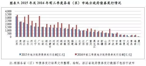 2015年12月,财政部下发了财预[2015]225号文件,提出对地方政府债务实行限额管理,省级人民政府要严格按照限额举借地方政府债务。2016年1月,财政部下发了财库[2016]22号文件,重申了地方政府债务限额管理原则,并对2016年地方政府债券发行工作做出了指导意见。2016年前三季度,全国34个省(区)市发行了地方政府债券,发行支数合计259支,发行金额合计5.08万亿元。