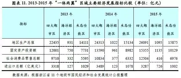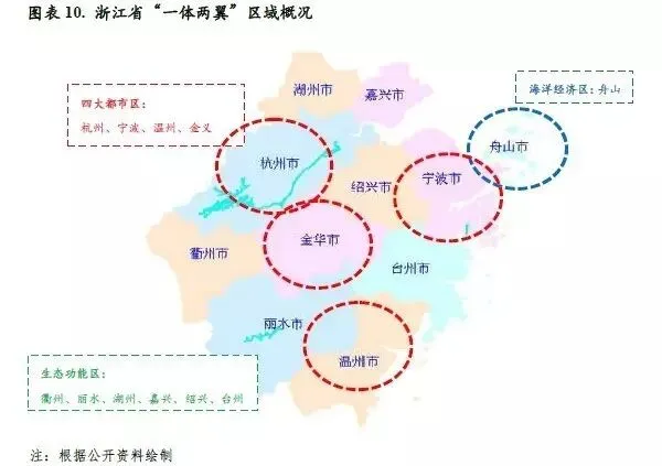 在《十三五规划纲要草案》中,浙江省提出加快构建以四大都市区为主体、海洋经济区和生态功能区为两翼的“一体两翼”区域发展新格局。杭州、宁波、温州、金华-义乌四大都市区的中心城市集聚高端要素,发展高端产业;舟山聚焦国家海洋战略;衢州、丽水聚焦绿水青山战略;湖州、嘉兴、绍兴、台州作为区域中心城市,聚焦功能均衡,生产、生活、生态融合,宜居、宜业、宜游并重。