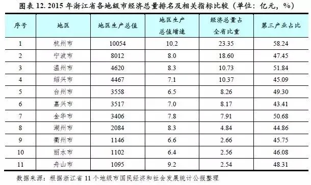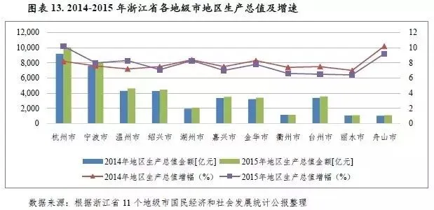 总体来看,以杭州、宁波、舟山为代表的信息经济、海洋经济等产业转型对浙江省地区生产总值起到了突出的拉动作用,而产业结构中以传统制造业为主的台州、金华、衢州等市正在经历结构调整期,增速有所下降。浙江省产业发展仍存在产业层次较低、高端产业占总量比重较低、增加值率较低、投资后劲不足的问题。