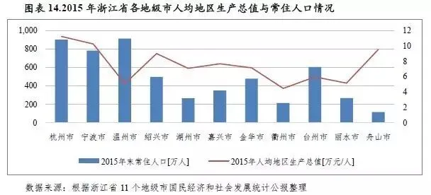 从区域经济发展水平来看,因浙江省内各地级市资源禀赋和发展战略导向的不同,区域经济发展水平存在一定分化。从十三五规划划分的区域格局看,杭州、宁波、温州、金义四大现代都市区总体经济发展水平较高;被划分至生态功能区的衢州、丽水、湖州、嘉兴、绍兴、台州等市的经济发展水平相对次之;海洋经济区舟山市目前经济总量规模较小,但得益于地缘优势和国家政策扶持,发展潜力大。从2015年浙江省各地级市经济总量及其占全省的比重看,各地级市经济总量可分为三个梯队,其中,省会城市杭州和计划单列市宁波两市为第一梯队;传统制造业较强的温州、绍兴、台州、嘉兴、金华五市为第二梯队;湖州、衢州、丽水和舟山四市为第三梯队。