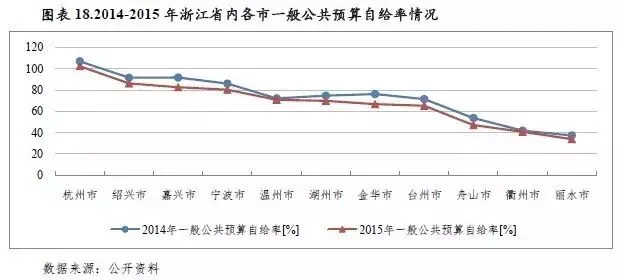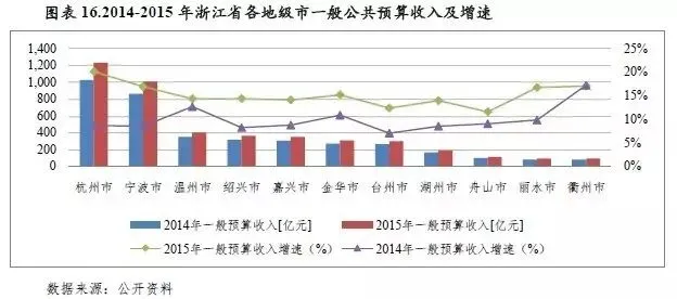 从一般公共预算增速来看,2015年浙江省各地级市一般公共预算收入增速普遍呈增长态势,且增速普遍高于2014年。2015年所有地级市一般公共预算收入增速均为两位数,但2014年增速为两位数的仅有温州市、金华市和衢州市。其中杭州市一般公共预算收入增长最快,增速为20.11%,较上年增加11.42个百分点。