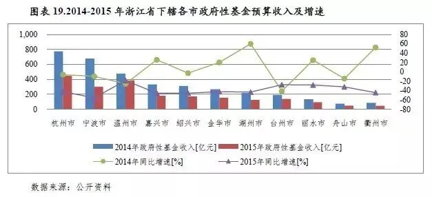 2015年,浙江省政府性基金预算收入同比下降约40%,下辖各市政府性基金预算收入也均呈大幅下降趋势,其中宁波市降幅最大,同比下降55.45%;温州市降幅最小,同比下降18.47%。11个地级市中有7个下降幅度超过40%。从政府性基金预算收入规模看,2015年杭州市、温州市和宁波市政府性基金预算收入规模较大,分别为446.54亿元、388.10亿元和301.41亿元,分列省内各市前三,规模上远超其他地级市;政府性基金收入在100亿元以下的地级市有丽水、舟山、衢州三市,分别为96.49亿元、50.29亿元和47.73亿元。