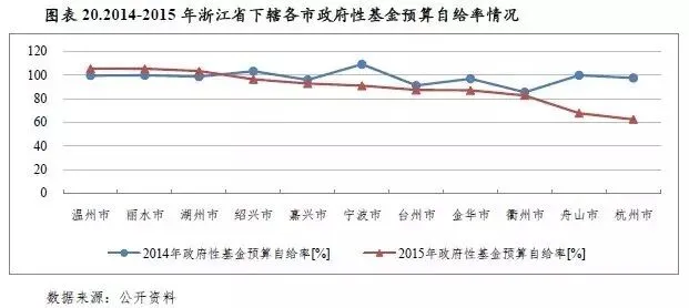 从政府性基金预算自给率情况看,除舟山市和杭州市外,浙江省下辖各市政府性基金预算自给率均超过80%,其中政府性基金预算自给率在100%以上的包括温州、丽水、湖州三市,分列全省前三。受2015年政府性基金收入大幅下滑影响,除温州、丽水、湖州三市外,其余各市政府性基金预算自给率均较2014年下降,以杭州市和舟山市降幅最大,分别较上年下降35.06个百分点和32.13个百分点,2015年政府性基金预算自给率分别将至62.53%和67.70%。