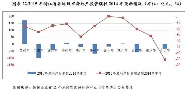 从房地产开发投资增速来看,受房地产市场调整影响,2015年所有地级市房地产投资增速较2014年大幅放缓,其中7个城市出现负增长,分别是舟山市(-14.3%)、台州市(-11.6%)、嘉兴市(-12.8%)、宁波市(-7.5%)、湖州市(-5.6%)、温州市(-5.3%)和金华市(-4.7%)。随着G20峰会和亚运会等国际盛事在杭州举办,2015年杭州市房地产投资表现强劲,增幅达7.4%,位居全省第一。