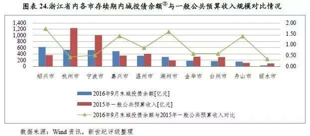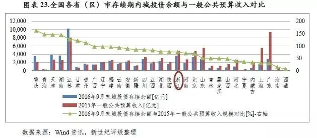 从省本级城投债存续情况看,2016年9月末浙江省省本级存续期内城投债余额为236.40亿元,与2015年省本级一般公共预算收入(352.70亿元)的比重为0.67,规模相对较小,浙江省省本级存续期内城投债偿付压力总体尚可。