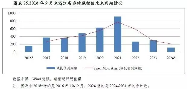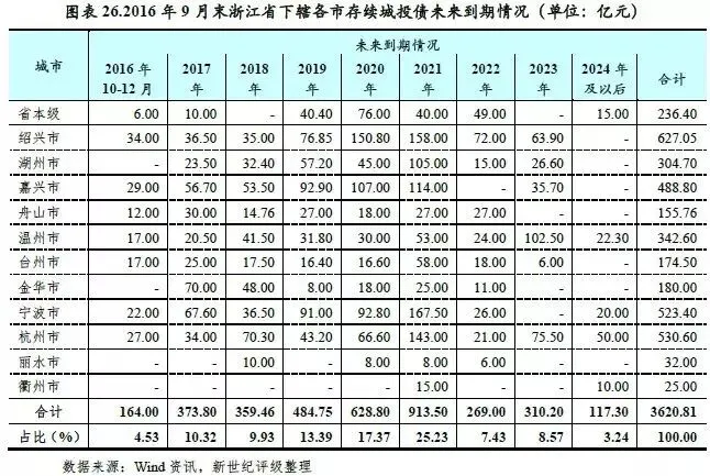 从存续期城投债的到期时间来看,浙江省城投债到期需偿还债务额主要分布在2017-2021年。继2018年到期规模较2017年小幅下降后,2018年期到期规模逐年稳步增加,并于2021年到达顶峰后大幅减少。2016-2021年浙江省到期需偿还的城投债总额占截至2016年9月末存续期内城投债余额的比重分别为4.53%、10.32%、9.93%、13.93%、17.37%和25.23%。
