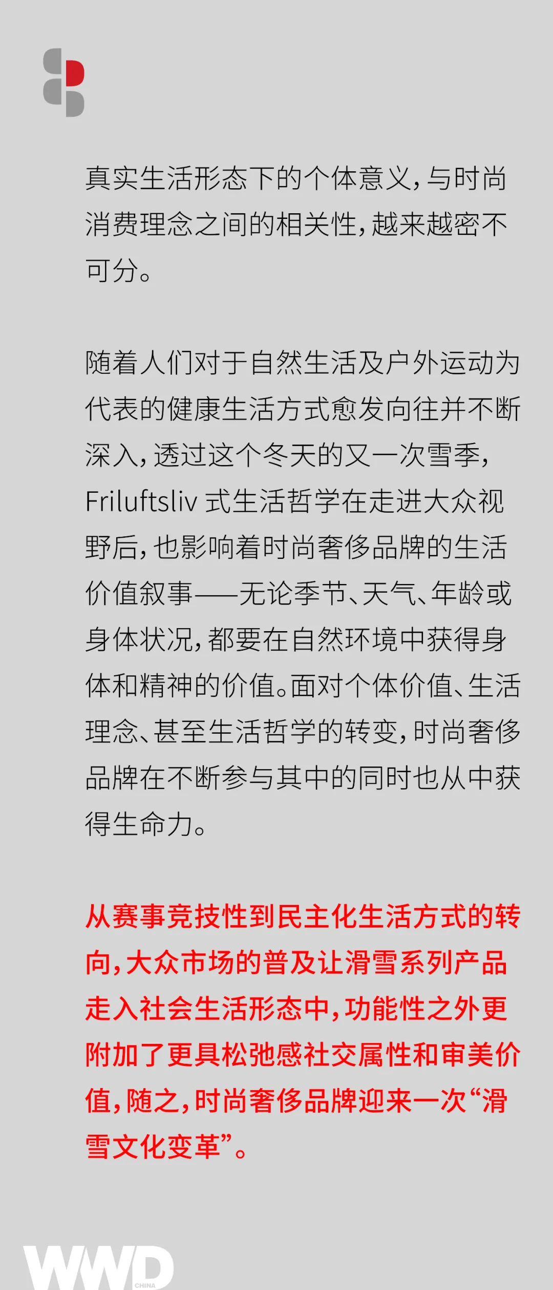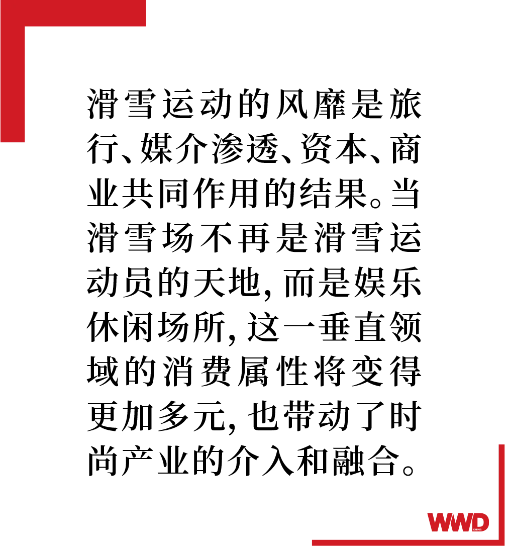 随着滑雪运动的普及,以及雪场等基础设施的升级,因此在专业度之外,雪服设计便有了更多的空间去考虑时尚性,这一硬通货也成为时尚品牌的 new money。