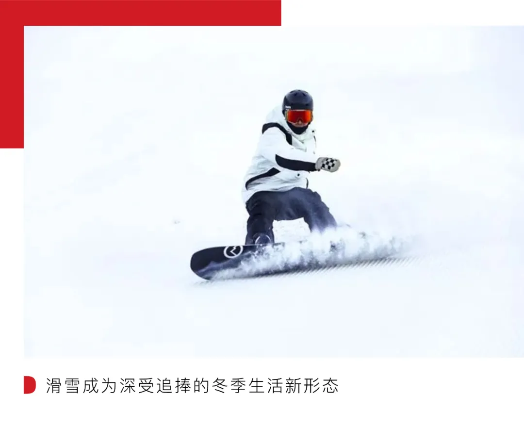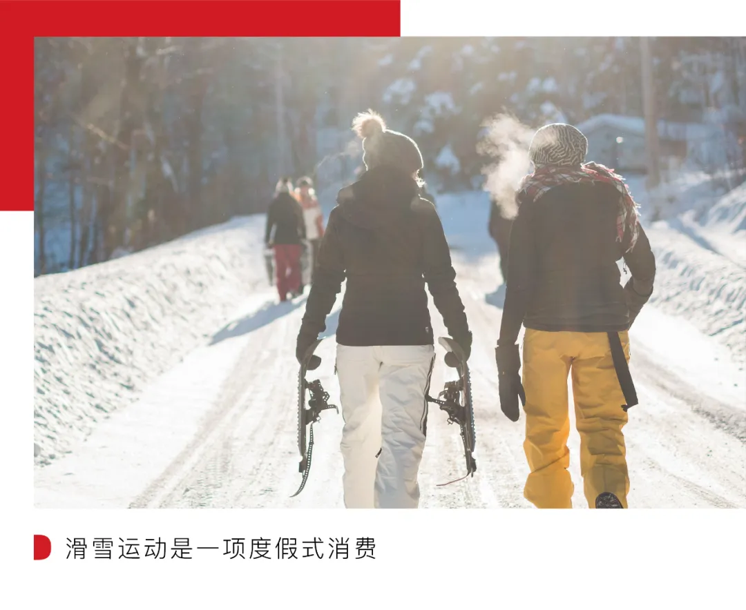 在这种非竞争性概念下,滑雪成为“生活家”的共同话题。数据显示,中国参与滑雪运动的人群主要集中在 30 岁、一二线城市的中高收入群体,年轻、高知、白领成为雪圈群体关键词。环境历史学家 William Cronon 认为,“很大程度上,享受原始天然景观的定价取决于目标人群”。而这类人群对物质背后的心灵强度的重视,也挖掘出了这一生活方式下更大的消费空间。在过去,讨论起滑雪服与日常服饰的不同之处时,常常聚焦于功能性、以及材质特殊性等产品层面,更进一步看,事实上更是理性功能和感性美学高度结合,滑雪服饰有着明显区隔于日常时装的表演属性。中产阶级的消费能力也创造了稳定的市场基础,在大众媒介氛围的烘托下,雪地时尚更成为撬动增长的全新利基市场。据中国冰雪产业发展研究报告(2023)数据显示,2023 年我国冰雪产业规模将达到 8900 亿元,2025 年超过万亿,预计占中国体育产业总产值的五分之一。其中,中国滑雪产业市场也正进入高速成长期,预计市场规模将从 2018 年的约 380 亿,加速增长至 2027 年的 2200 亿以上。对于大多数滑雪消费者来说,滑雪运动是一项度假式消费,而这一定位也让滑雪服饰和装备拥有着更大的市场潜力。根据《中国滑雪产业白皮书(2022-2023)》研究显示,在中国滑雪运动的核心客群中,以运动+旅游度假为诉求的“城郊学习型”和“目的地度假型”用户呈现一定的上升趋势,平均停留时长也超越单次体验型客群。
