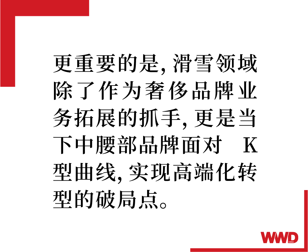 事实证明,奢侈品牌与运动品牌在滑雪领域上已经达成了共识——在相互借力和共同成长的过程中,运动品牌能够帮助奢侈品牌拓宽细分业务,实现专业化渗透,而奢侈品牌的潮流化设计,也能让运动品牌产品摆脱枯燥和单一,通过时尚化和个性化的提升捕捉更大的消费客群。更重要的是,滑雪领域除了作为奢侈品牌业务拓展的抓手,更是当下中腰部品牌面对 K 型曲线,实现高端化转型的破局点。