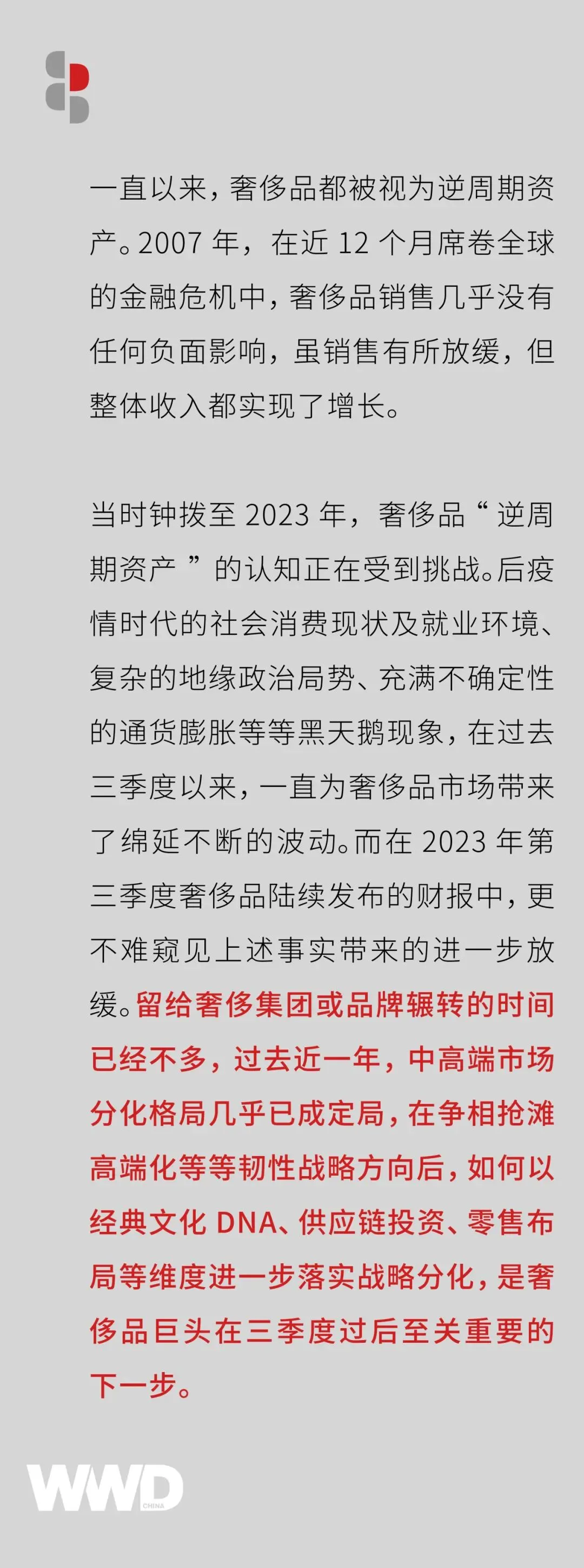 面对激烈的市场竞争和持续分化的全球消费趋势,探索多元化的战略路径,在适应不断变化的市场过程中主动“拉拢”消费者,同时避免在转型过程中被“祛魅”,正在成为奢侈品集团面临“行业超级周期”即将结束时期的一道长期议题。WWD