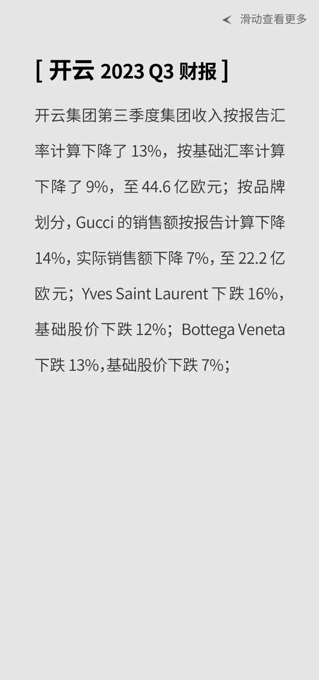 开云集团三季度财报于昨日发布。数据显示,开云集团第三季度的业绩出现两位数的下滑,营收下降 13% 至 44.6 亿欧元,集团最大的品牌 Gucci 营收大跌 7%,YSL 销售额跌至 16% 。