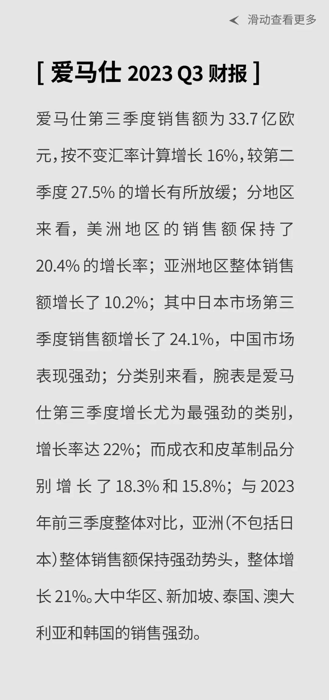 整个大中华地区业绩上涨 3.5%,管理层表示对大中华及泛亚太地区的战略充满信心。爱马仕亚太市场表现强劲。与 2023 年前三季度整体对比,亚洲(不包括日本)整体销售额保持强劲势头,整体增长 21%。大中华区销售强劲。