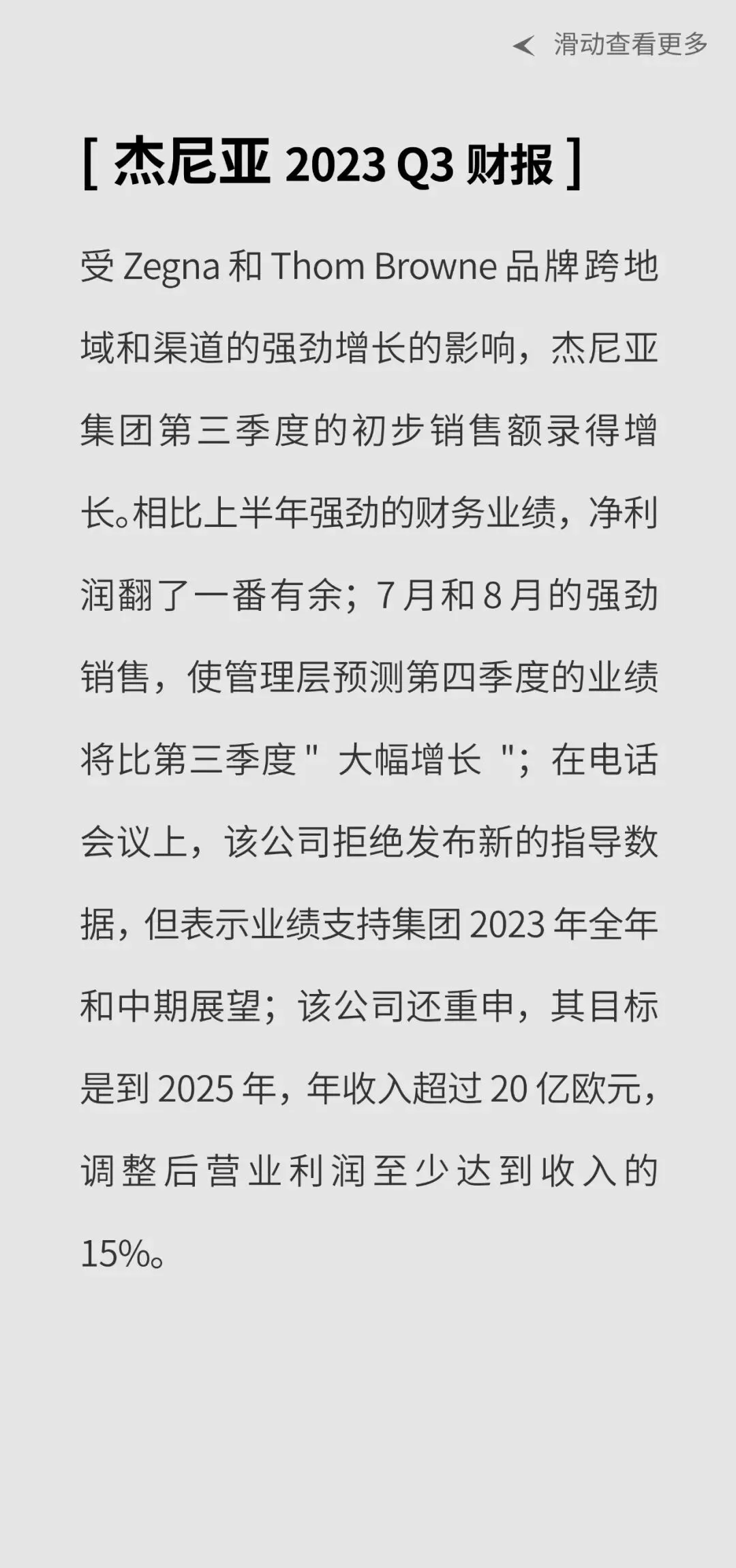 Brunello Cucinelli 2023 年秋冬及 2024 年春夏系列反馈良好。品牌创始人兼创意总监 Brunello Cucinelli 表示,最近两季服装在迎合低调奢华潮流的同时也彰显了品牌个性,目前市场对高品质、手工制作的服装需求旺盛。Brunello Cucinelli 在发布三季度财务数据时,提高了全年销售增长预期,预计2024年增幅将达10%左右。”