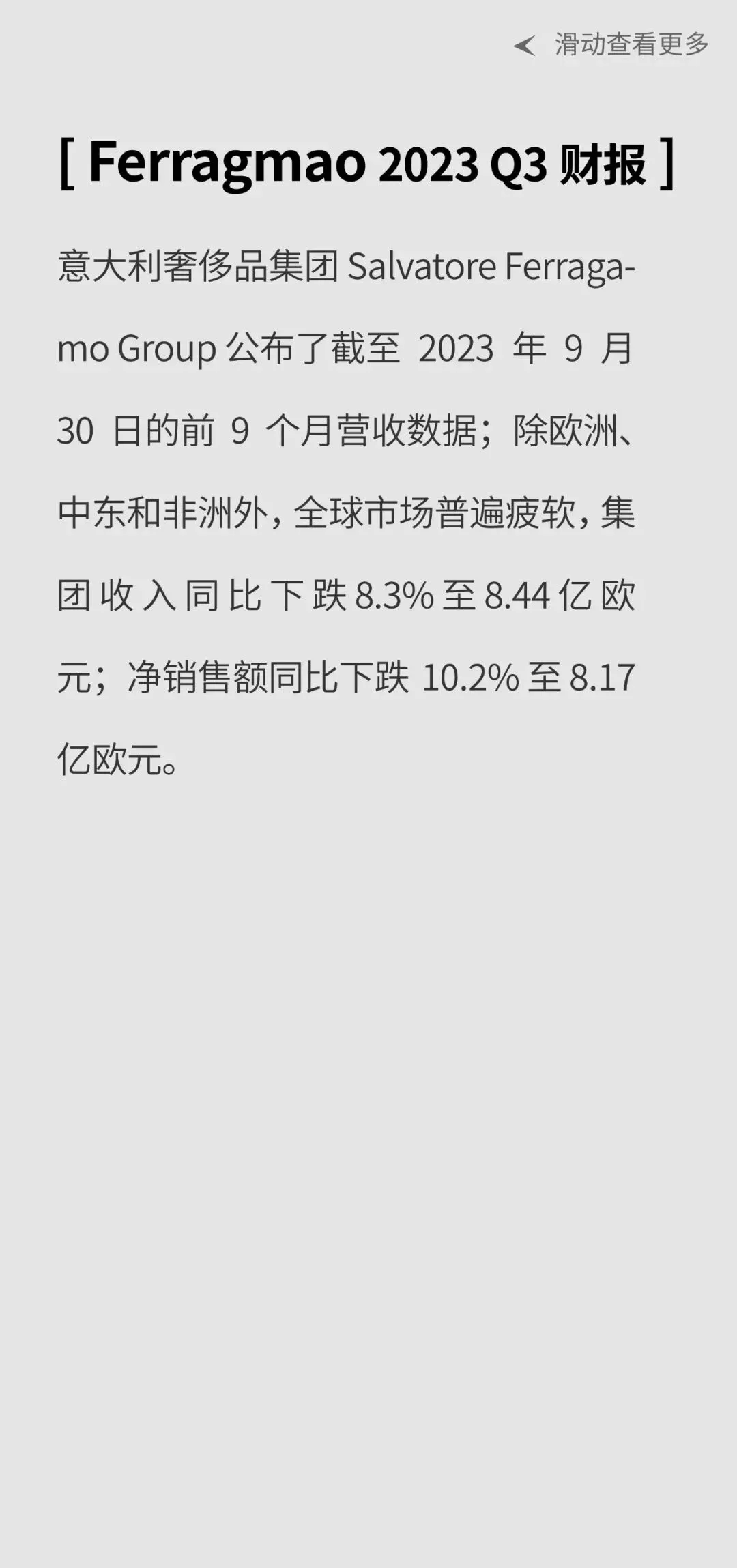 当天早些时候,竞争对手爱马仕的三季度财报也释放了同样的“悲观”信号。尽管第三季度销售额增长16%,但相较第二季度,营收增长直接腰斩。Brunello Cucinelli 勉强维持三季度收入与一、二季度持平。Ferragmao 财报更指出,集团全球市场几乎普遍疲软,集团收入同比下跌 8.3% 。
