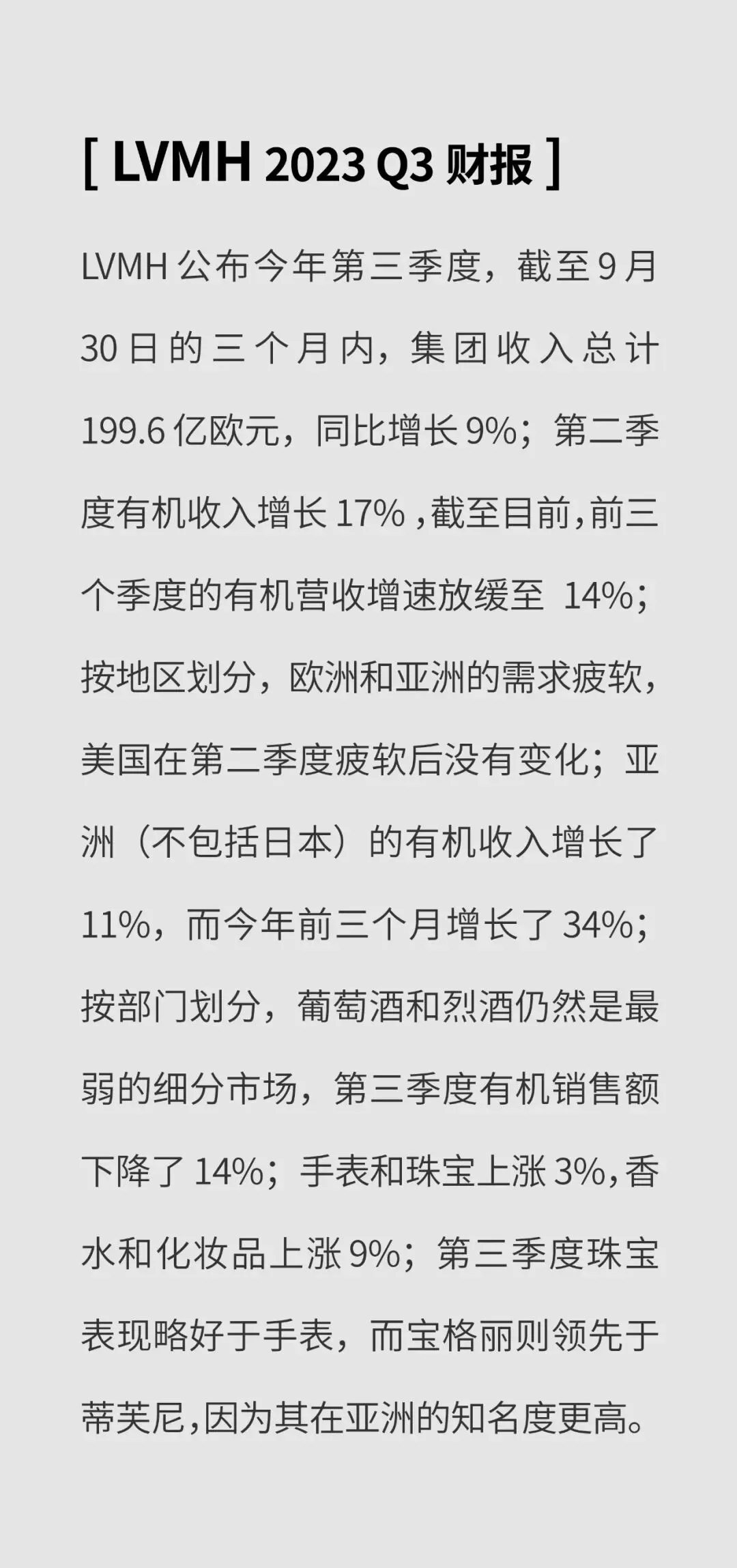 面临相似情况的是早先引起业内广泛讨论的 LVMH 三季度财报。在截至 9 月 30 日的三个月内,全球最大奢侈品集团 LVMH 销售额同比仅增长 1% 至 199.6 亿欧元,数字低于此前分析师预期的211.4亿欧元。这是今年内 LVMH 的营收首次逊于预期。