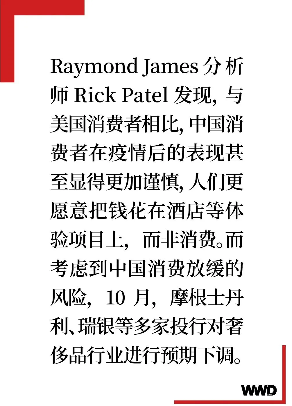 但值得指出的是,尽管疫情后全球各地迎来大量游客的回归,旅游消费已发生很大的变化,Raymond James 分析师 Rick Patel 发现,与美国消费者相比,中国消费者在疫情后的表现甚至显得更加谨慎,人们更愿意把钱花在酒店等体验项目上,而非消费。而考虑到中国消费放缓的风险,10月,摩根士丹利、瑞银等多家投行对奢侈品行业进行预期下调。