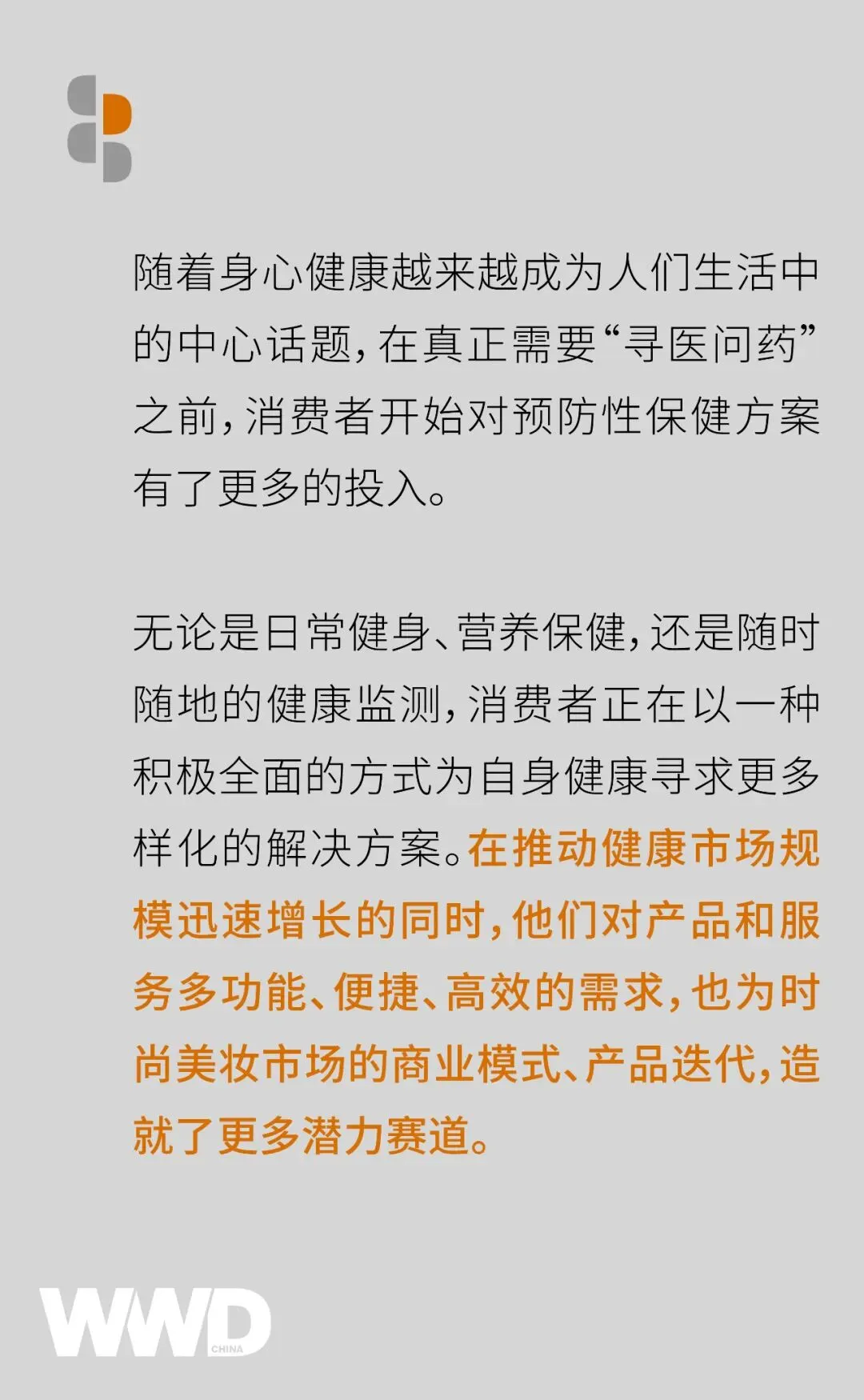 消费者对健康的投入迎来前所未有的增长势头。全球健康研究所(Global Institute of Wellness)的数据显示,到 2025 年,全球健康市场的规模预计将达到 7 万亿美元,个人护理和美容将成为其中最大的领域。受疫情影响,消费者对健康的态度发生了巨大的变化,市场研究公司 Wakefield Research 2022 年的一份报告指出,超过一半的美国人每周至少进行一次预防性健康项目。同时,麦肯锡公司指出,随着消费者积极主动地寻求相关产品和服务,他们也在期待更多功能的选择,从而能够在日常生活中获得最高效率和最大程度的便利。比如,穿戴设备 Oura 指环就可以提供一系列关于睡眠、心率等指标的健康信息,类似这样的产品很可能会凭借其多维功能而越来越受欢迎。随着消费者的需求不断增长,对健康产品的诉求更加多样化,健康产业也迎来了高速增长的机遇,而以下六大细分领域可能将成为 2023 年健康产业的主要驱动力。由于人们开始关注健康的各个方面,过去几年市场迎来了健身热潮。然而,消费者的健康习惯在新冠疫情期间发生了变化,健身房会员数和健身房上课的人数正在慢慢恢复到疫情前的水平,与此同时,消费者也热衷于数字健身平台。NPD 集团副总裁兼高级体育产业顾问 Matt Powell 此前告诉 WWD,消费者正在寻求“灵活性、易得性和多功能性”。像 Melissa Wood-Tepperberg 这样的短视频创作者正在通过简短实用的健身和健康内容不断扩展他们的平台。体育与健身行业协会(Sports & Fitness Industry Association)的一份报告称,人们需要一些能够同时照顾到身心健康的锻炼——比如瑜伽和散步,在健身中建立身心联系也变得十分关键。过去几年,健康市场出现了一大批定位更年期客群的新品牌:比如 Womaness、Pause Well-Aging、Wile、Stella Via 和 Stripes by Naomi Watts 等等。WSL 战略零售公司首席执行官 Wendy Liebmann 表示,预计到 2025 年将有 10 亿人进入更年期,这一趋势仍会持续存在。“有很多人,包括名人和普通人开始涉足这个领域。大家已经开始讨论更年期这个话题了。”她说道。零售商们也注意到了这一点,比如 Ulta Beauty 举办了一个旅行式教育项目“积极更年期之旅”,与 Womaness 一起在“更年期宣传月”期间向消费者传播与此相关的信息。Liebmann 同时表示,随着一系列独立品牌涌现,医疗行业和一些大公司可能会开始投资或支持这一领域,比如 Amyris 就协助开发了 Stripes 品牌。在消费者看来,营养补剂既方便又亲民,可以全面提高身体的健康水平,这也因此成为了健康产业中的一个重要品类,其中,软糖形式的营养品受到热捧,与此同时,各大品牌也在尝试其他形式的营养补剂。“维生素和矿物补剂这样的产品正在以许多其他的形式出现,比如冲剂、营养棒、粉末等,”Liebmann 说道,“尤其是年轻的消费者,虽然他们仍然接受口服维生素这种传统形式,但他们也想尝试以各种不同的、简便便携的方式来摄入维生素。”各大品牌也响应了这一需求:Sourse 选择了巧克力,Kindroot 采用了含片形式,Glow Beauty Fuel 将产品包装成美味的营养棒,而 8Greens 则将其包装成棒棒糖。此外,消费者也偏向能够提供量身定制的选择,比如 Nutrafol 的定制生发补剂、Musely 的个性化护肤方案、Olly 的睡眠软糖或 Heights 有益于大脑健康的补剂,Spins 的数据显示,能够改善情绪的维生素增长了 43%。Liebmann 解释说道:“在未来一年左右的时间里,我们将看到健康产业出现一系列新的技术、服务或工具,因为人们希望去探索如何才能达到身体健康的目标。在商场或临街店铺,这类服务正在扩张,到 2023 年,这样的服务会更多。”从 Remedy Place 的冰浴到 Sephora 的海菲秀(HydraFacial),再到遍布各个角落的新型“快速美容吧”,健康服务在不断扩张。而投资者也关注到了这点,去年 12 月,美容机构 Heyday 获得了 1200 万美元的 B 轮融资,而上月主打“30 分钟美容”的 Glowbar 获得了 1000 万美元的 A 轮融资。消费者的消费意愿推动了美容健康服务的增长,根据麦肯锡的数据,大约 45% 的消费者打算明年在相关的线下或线上服务上花费更多。随着可穿戴设备不断发展,消费者已可以随时知晓自己的身体状况,了解几乎涵盖了所有细枝末节的数据。在 Fitbit 和 Apple Watch 大受欢迎之后,如今这类产品的设计更加精致,技术更新迭代,操作也更加便捷。Grand View Research 的数据显示,到 2030 年,这类产品的全球市场规模预计将达到近 2000 亿美元。各大品牌都以独特的产品来赶上这一趋势。Therabody 的 SmartGoggles 可以同时用作眼罩和按摩器;Nowatch 的无屏智能手表称其可以提前一小时就预测到压力;Nix 的 Hydration Biosensor 可以跟踪锻炼时的水分水平;而 Whoop 则与 Oura 类似,通过一个低调时尚的腕带来追踪健康数据。健康当然是一个充满创新的领域,但久经考验的老方子则永远不会过时。“我认为在某些方面,新事物其实还是旧的东西。我并不是指那些消极的方面,而是那些母亲,祖母或其他人告诉我们的传统,”Liebmann 说,“这些东西重新复兴,我认为这些领域将会有更好的发展。”她举例说,在家里用姜黄泡茶,可能就是人们会在日常进行的一种自然疗法。与此同时,一些品牌也进入了市场,让更多人能够接触到自然或传统的护理养疗方案。例如,Elix 提供个性化的草药护理,以帮助调节女性的激素周期;Uma 则将传统的印度草药疗法——阿育吠陀疗法推向市场;同样,Mojave Desert Skin Shield 