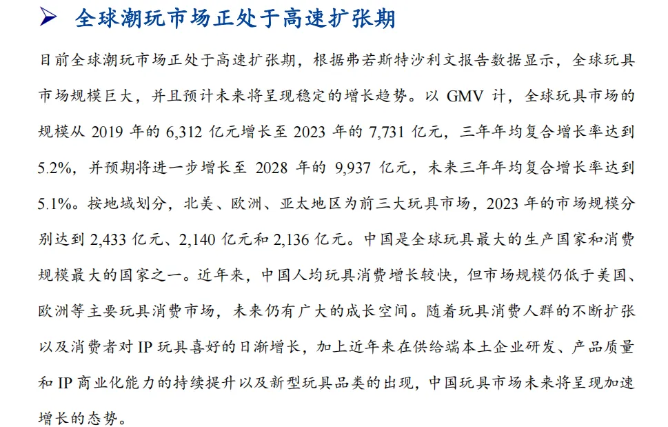全球玩具市场 2019-2023 年年均复合增长率 5.2%,2023 年达 7731 亿元,预计 2028 年将至 9937 亿元。中国潮玩市场表现亮眼,2024 年规模 727 亿元、增速 26%,年复合增长率 9.5% 远超全球平均的 5.1%。