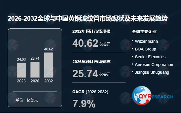 根据QYR(恒州博智)的统计及预测,2025年全球黄铜波纹管市场销售额达到了24.03亿美元,预计2032年将达到40.62亿美元,年复合增长率(CAGR)为7.9%(2026-2032)。
