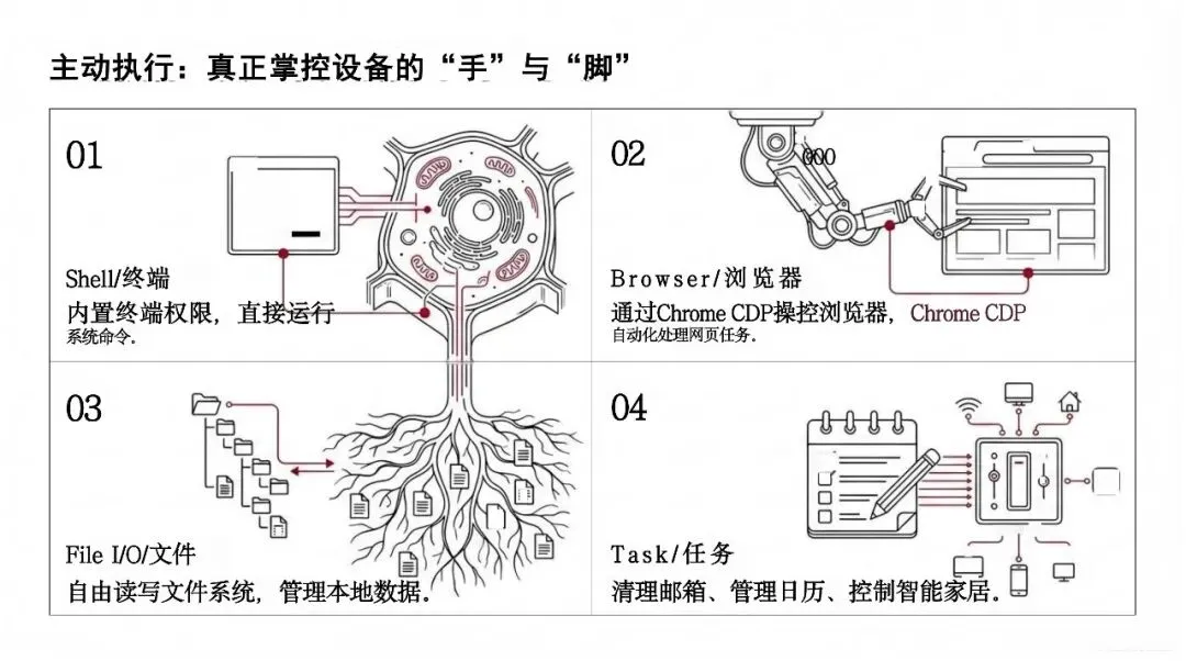 技术架构上,其构建了大脑、交互、记忆、执行四层自治闭环,支持模型热切换、本地持久化记忆、全平台多通道交互与系统级执行权限,具备主动执行、自我进化、统一控制等核心特性,彻底实现 AI 从 “对话” 到 “行动” 的范式转变。