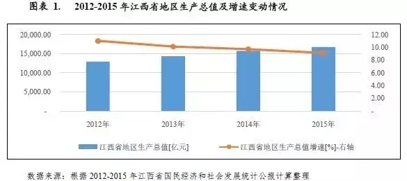 江西省东邻浙江省、福建省,南连广东省,西接湖南省,北毗湖北省、安徽省而共接长江,属于华东地区。江西省河网密集,拥有全国最大的淡水湖——鄱阳湖,是中国淡水渔业重点省份之一;其农业在全国占有重要地位,是建国以来从未间断向国家贡献粮食的两个省份之一,拥有江南的“鱼米之乡”之称;同时,江西省的矿产资源丰富,目前已经建成亚洲最大的铜矿和全国最大的铜冶炼基地。近年来,江西省的经济发展保持良好态势,经济增速位于全国前列,后发优势明显。经初步核算,2015年江西省实现生产总值16723.8亿元,经济总量排名保持在全国第18位;GDP同比增长9.1%,较上年下滑0.6个百分点,经济增速全国排名上升至第5位。江西省产业结构进一步优化,经济增长仍主要依靠第二产业带动,2015年三次产业结构由上年的10.7:52.5:36.8调整为10.6:50.8:38.6,三次产业对GDP增长的贡献率分别为4.2%、60.7%和35.1%。