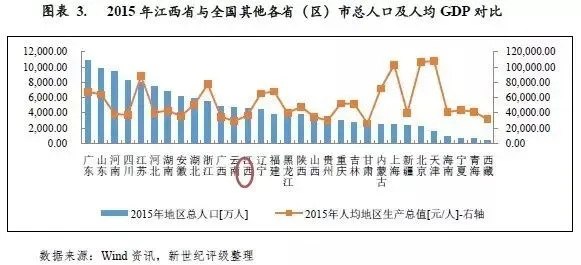 2015年末,江西省常住人口为4565.60万人,较上年末增长0.52%,常住人口总量位列各省(区)市第13位;同期末江西省人均GDP为36724元,同比增长8.5%,折合5898美元,位列各省(区)市第24位,排名相对靠后。