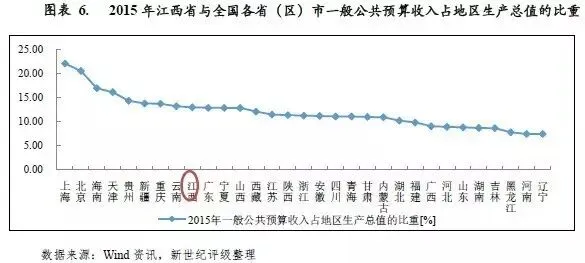 与经济总量相比,江西省一般公共预算收入占地区生产总值的比重较高,2013-2015年分别为11.30%、11.98%和12.95%。2015年,江西省一般公共预算收入占地区生产总值的比重位列全国各省(区)市第9位,排名靠前,单位地区生产总值形成财政收入的能力强。