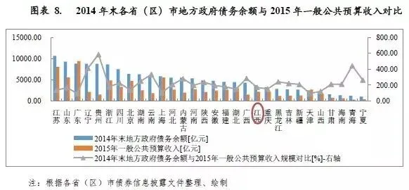 以地方政府债务余额与一般公共预算收入规模相对比,2014年末江西省地方政府负有偿还责任的债务余额是其2015年一般公共预算收入的1.70倍,位列全国各省(区)市降序第21位,处于相对较低水平;同期末,贵州省、青海省、辽宁省、云南省、广西壮族自治区和内蒙古自治区地方政府债务余额分别是其2015年一般公共预算收入的5.84倍、4.42倍、4.13倍、3.32倍、2.83倍和2.79倍,位列全国各省(区)市前六。