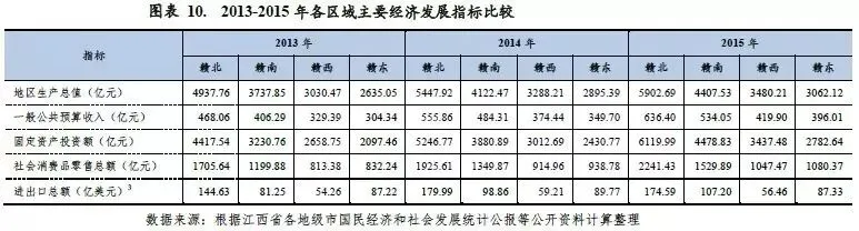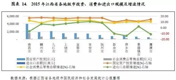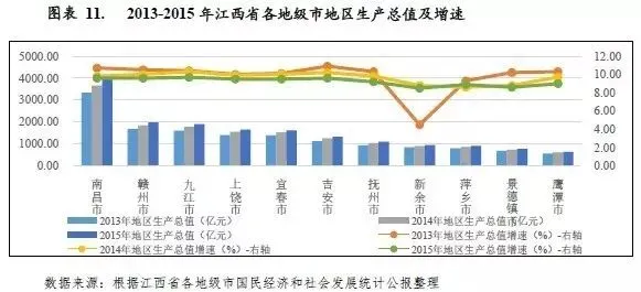 江西省区域经济仍处于建设起步阶段。从经济规模来看,由南昌和九江组成的赣北地区作为江西省的核心区域,经济总量居于江西省四个板块之首。2015年南昌和九江分别实现地区生产总值4000.01亿元和1902.68亿元,共占当年全部地区生产总值的35.72%。江西省其他区域发展相对滞后,但赣南地区作为原苏区老基地,在政策扶持下近几年发展迅速;以宜春市为首的赣西地区和以上饶市为首的赣东地区经济实力偏弱。2015年赣南、赣西和赣东地区分别实现地区生产总值为4407.53亿元、3480.21亿元和3062.12亿元,占当年全部地区生产总值的比重分别为26.35%、20.81%和18.31%。