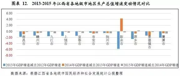 从经济增速来看,受宏观经济下行压力影响,江西省各地市经济增速放缓,但仍保持在较高水平。2015年除新余市、萍乡市和景德镇市外,其他8市增速均保持在9%以上,其中九江市以9.7%的增速位居全省第一;增速最低的为新余市,地区生产总值增速为8.5%;其余各地市增速基本持平。从地区生产总值增速变动情况看,受产业结构调整和工业增速明显下滑等因素影响,近三年江西省各地市经济增速均呈回落态势。2013年江西省各地级市经济增速均为负增长;2014年除新余市外,其他各地市继续保持增速负增长的态势,但下降速度有所放缓;2015年除萍乡市经济增速较上年上升0.3个百分点外,其他10个地级市依然呈增速下降态势,且降幅有所扩大,江西省经济增长面临一定下行压力。