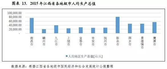 2015年江西省人均生产总值为4.33万元,各地市人均生产总值数额分布较分散。其中新余市作为江西省的新兴工业城市,由于其工业化程度高、常住人口少,同期人均生产总值为8.14万元,居各地市首位;南昌市作为江西省的省会城市,当年人均生产总值为7.59万元,位居各地市第二。同期宜春市、抚州市、吉安市、上饶市和赣州市人均生产总值均低于3万元,分别为2.95万元、2.77万元、2.71万元、2.46万元和2.05万元。