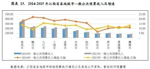从江西省下辖市的经济财政情况看,赣北地区在省会南昌市拉动下,经济及财政实力处于较高水平;赣南、赣西和赣东地区发展相对滞后,目前区域抗风险能力较弱。江西省各地市一般公共预算收入规模和结构与经济发展状况基本保持同步,从收入质量来看,税收收入占一般公共预算收入的比重较高,收入稳定性较强,但各地级市一般公共预算自给率普遍不佳、收支平衡主要依赖于上级补助收入。受宏观环境下行压力和房地产市场调整等因素影响,2015年江西省各地级市政府性基金预算收入出现不同幅度的下滑,且集中于相对发达地区。与一般公共预算收入规模相比,江西省各地级市对政府基金预算收入的依赖程度相差较大,但整体处于较低水平。债务方面,江西省城投债存续余额处于全国中游水平,与一般公共预算收入规模相比,城投债发债规模尚处于可控范围之内,偿付压力相对较小。