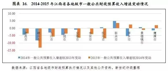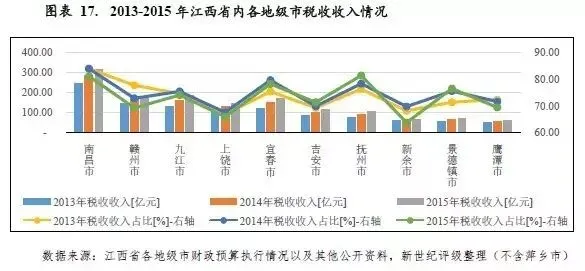 从增速看,受经济下行因素影响,近年来江西省经济和财政实力较强的地级市一般公共预算收入增速普遍呈下滑态势,但仍保持在较高水平。2015年南昌市一般公共预算收入增速为13.70%,较上年下降3.50个百分点。同期增速下降最为明显的为抚州市和宜春市,当年一般公共预算收入增速分别为9.00%和12.98%,较上年下降6.80和6.42个百分点。此外,经济发展程度较低的新余市、萍乡市和鹰潭市2015年一般公共预算增速保持增长状态,分别为9.90%、12.60%和13.10%,增速较上年分别增加3.50、2.50和2.10个百分点。
