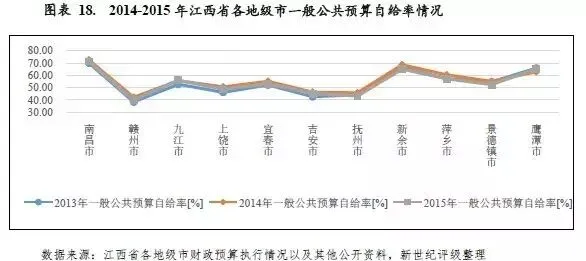 从一般公共预算自给率看,江西省各地市一般公共预算收支平衡能力总体偏弱。2015年南昌市和鹰潭市的一般公共预算自给率排名前两位,分别为71.09%和65.02%。同期,赣州市的一般公共预算自给率为39.92%,对上级转移支付以平衡资金缺口的依赖程度最高。