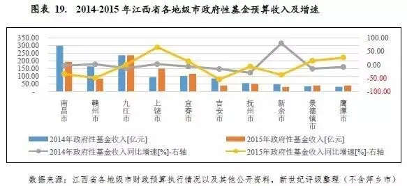 受土地市场不景气的影响,2015年江西省政府性基金预算收入较上年下降12.50%,下辖各地级市政府性基金预算收入也出现不同幅度的下滑,且集中于相对发达地区。同期,南昌市和赣州市政府性基金预算收入分别为194.10亿元和83.54亿元,分别较上年下降35.00%和48.90%。
