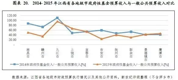 受宏观环境下行压力和房地产市场调整等因素影响,2015年江西省部分地市房地产投资增速放缓,部分地区出现负增长状态;受此影响,各地级市政府性基金预算收入出现不同幅度的下滑,且集中于相对发达地区。与一般公共预算收入规模相比,江西省各地级市对政府基金预算收入的依赖程度整体处于较低水平,但九江等个别地市的地方财力对政府性基金预算收入的依赖度较大,未来需关注其财力稳定性。