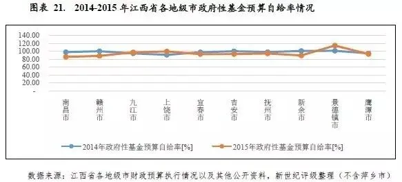 从政府性基金预算自给率情况看,江西省各地级市政府性基金预算收入对其支出的覆盖程度较好,2015年政府性基金预算自给率均超过85%,其中景德镇市政府性基金预算自给率为114.43%,位列各地市首位。南昌市和赣州市政府性基金预算收入对其支出的覆盖程度相对欠佳,2015年政府性基金预算自给率分别为85.58%和88.11%。
