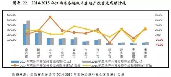 从增速来看,受宏观环境下行压力和房地产市场调整的影响,2015年江西省部分地市房地产投资增速放缓,且景德镇市和新余市房地产投资额出现负增长,分别同比下降25.8%和8.0%。同时,受城镇化进程加快以及旧城改造力度加大等影响,宜春市、鹰潭市和吉安市等地市的房地产刚性需求不断增加,2015年三市房地产投资同比增长分别为34.6%、28.5%和24.1%,近三年复合增长率分别为21.50%、25.57%和14.79%,位列江西省各地区前三。