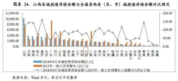 以城投债存续余额与一般公共预算收入规模相对比,2016年9月末重庆市、青海省、天津市、湖南省、江苏省、甘肃省和贵州省城投债存续余额规模较大,分别为当地2015年一般公共预算收入的1.62倍、1.47倍、1.46倍、1.45倍、1.27倍、1.22倍和1.12倍,上述地区城投债偿付压力相对较大。2016年9月末江西省城投债存续余额是其2015年一般公共预算收入的0.83倍,城投债发债规模处于可控范围内,偿付压力相对较小。