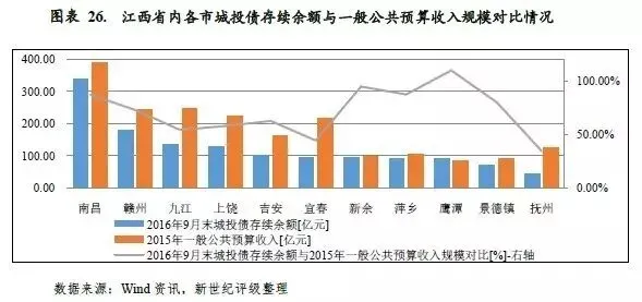 江西省各地市的城投债偿付压力可控,2016年9月末城投债存续余额超过当地2015年一般公共预算收入的仅鹰潭市,为1.09倍。其他省内各市2016年9月末城投债存续余额均小于当地2015年一般公共预算收入,其中少于2015年一般公共预算收入一半的地区有抚州市和宜春市,上述地区城投债偿付压力相对较小。