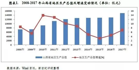 山西省是内陆省份,位于黄河中游东岸,华北平原西面的黄土高原,东以太行山为界,与河北为邻;西、南隔黄河与陕西、河南相望;北以外长城为界与内蒙古毗连。至2017年末,山西省下辖11个地级市、23个市辖区、95个县(市),总面积15.67万平方公里,全省常住人口3702.35万人(含城镇人口2113万人)。山西省经济对煤炭相关产业依赖度高,2017年以来煤炭价格上升,加之工业经济景气度阶段性回暖,经济运行整体好转。当年全省实现地区生产总值1.50万亿元,排名全国第24位[1];按可比价格计算,比上年增长7.0%,增速较上年上升2.5个百分点,经济增速略超全国GDP平均增速0.1个百分点,排名上升9位,但增速在全国仍处于中等偏后,为21位[2]。全省人均地区生产总值4.06万元,较上年增加5358元,但总量仅为全国水平的67.98%,位居全国26位;居民人均可支配收入2.06万元,比上年增长7.2%(扣除价格因素实际增长6.0%),总量为全国水平的78.62%,排名全国第23位。2018年前三季度,山西省实现地区生产总值1.16万亿元,按可比价格计算,比上年同期增长6.1%,经济发展相对平稳。